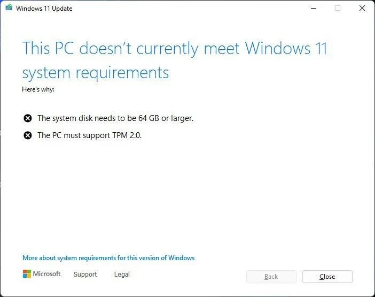 اگر با این پیام مواجه شدید که میگوید: "این رایانه در حال حاضر سیستم مورد نیاز سیستم عامل Windows ۱۱ را برآورده نمیکند"، این بدان معناست که یک یا چند جزء مورد نیاز وجود ندارد و اگر آنها را حل نکنید، نمیتوانید نصب را ادامه دهید.