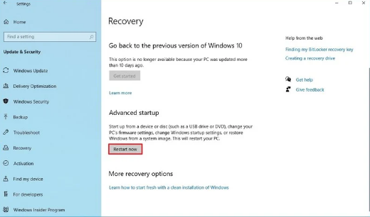 شایان ذکر است، تغییر تنظیمات نادرست میتواند کامپیوتر را غیر قابل بوت کند. فقط در مواقعی که دلیل موجهی دارید باید به تنظیمات مادربرد دسترسی پیدا کنید. برای رفتن به مادر برد ابتدا باید تنظیمات را باز کنید. بر روی Update & Security سپس Recovery کلیک کرده و در بخش "راه اندازی پیشرفته"، روی دکمه راه اندازی مجدد ضربه بزنید.