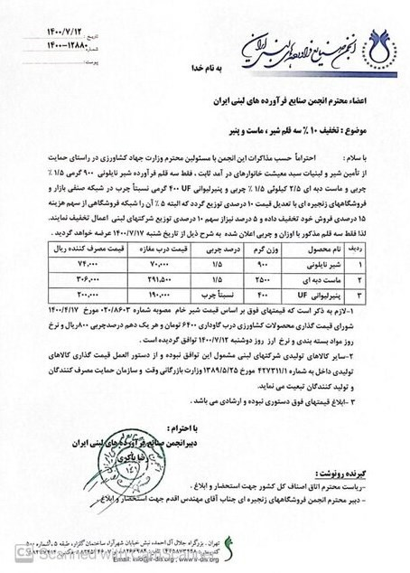 عطف به نامه شماره ۱۲۸۸۱ – ۱۴۰۰ مورخ ۱۴۰۰/۷/۱۴ دبیر محترم انجمن صنایع فرآوردههای لبنی ایران و با عنایت به مصوبات جلسه روز دوشنبه ۱۴۰۰/۷/۱۲ در دفتر معاونت برنامهریزی و امور اقتصادی وزارت متبوع با حضور نمایندگان محترم فروشگاههای زنجیرهای و انجمن صنایع لبنی و تصمیم متخذه در تخفیف ۱۰ درصدی قیمت مصرفکننده سه قلم کالای لبنی، مقتضی است دستور فرمائید از روز شنبه ۱۴۰۰/۰۷/۱۷ برای سه قلم کالای مندرج در جدول زیر قیمتهای جدید عملیاتی گردد.