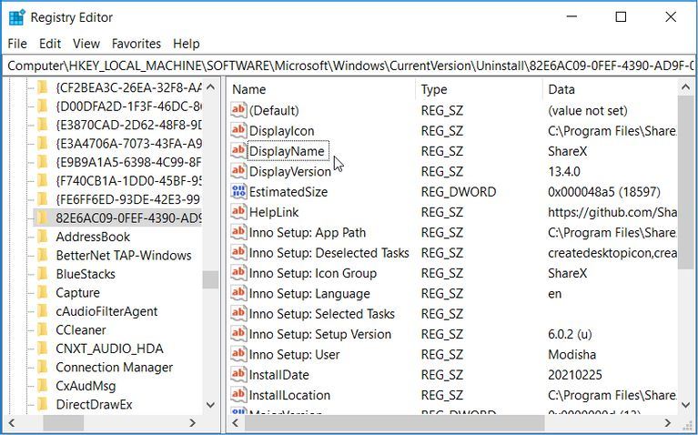 اگر نمیتوانید کلید رجیستری برنامه مدنظرتان را پیدا کنید، باید بیشتر به دنبالش بگردید. در زیر بخش کلید Uninstall، احتمالا چندین کلید همراه با شماره به چشمتان میخورد. روی هرکدام کلیک چپ کنید تا در پنجره سمت راست مقدار Display Name را چک کنید. این گزینه باید نام برنامه را نشان دهد.