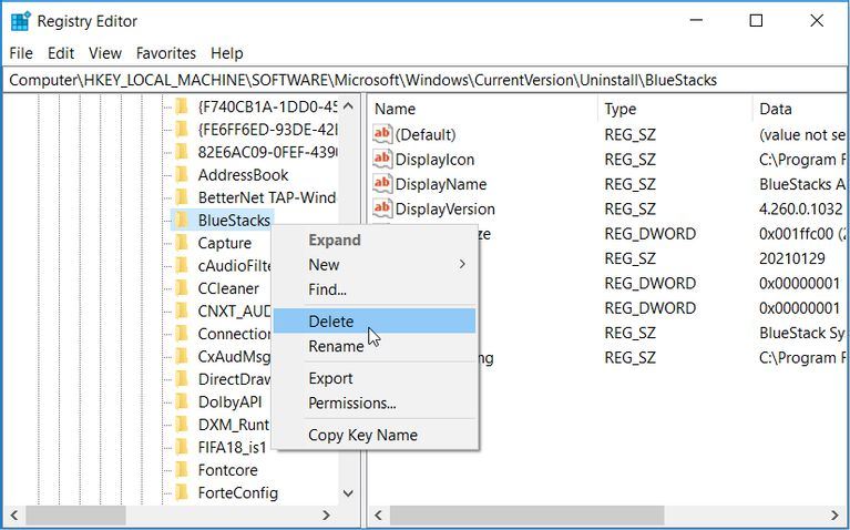 همانطور که میبینید، در زیر بخش Uninstall کلیدهای زیادی وجود دارد. به سمت پایین اسکرول کرده و کلیدی که نام برنامه مدنظرتان را یدک میکشد، انتخاب کنید. در نهایت روی کلید کلیک راست کرده و گزینه Delete را انتخاب کنید.
