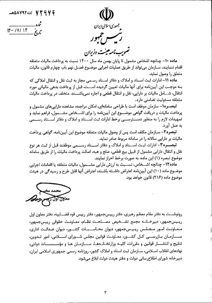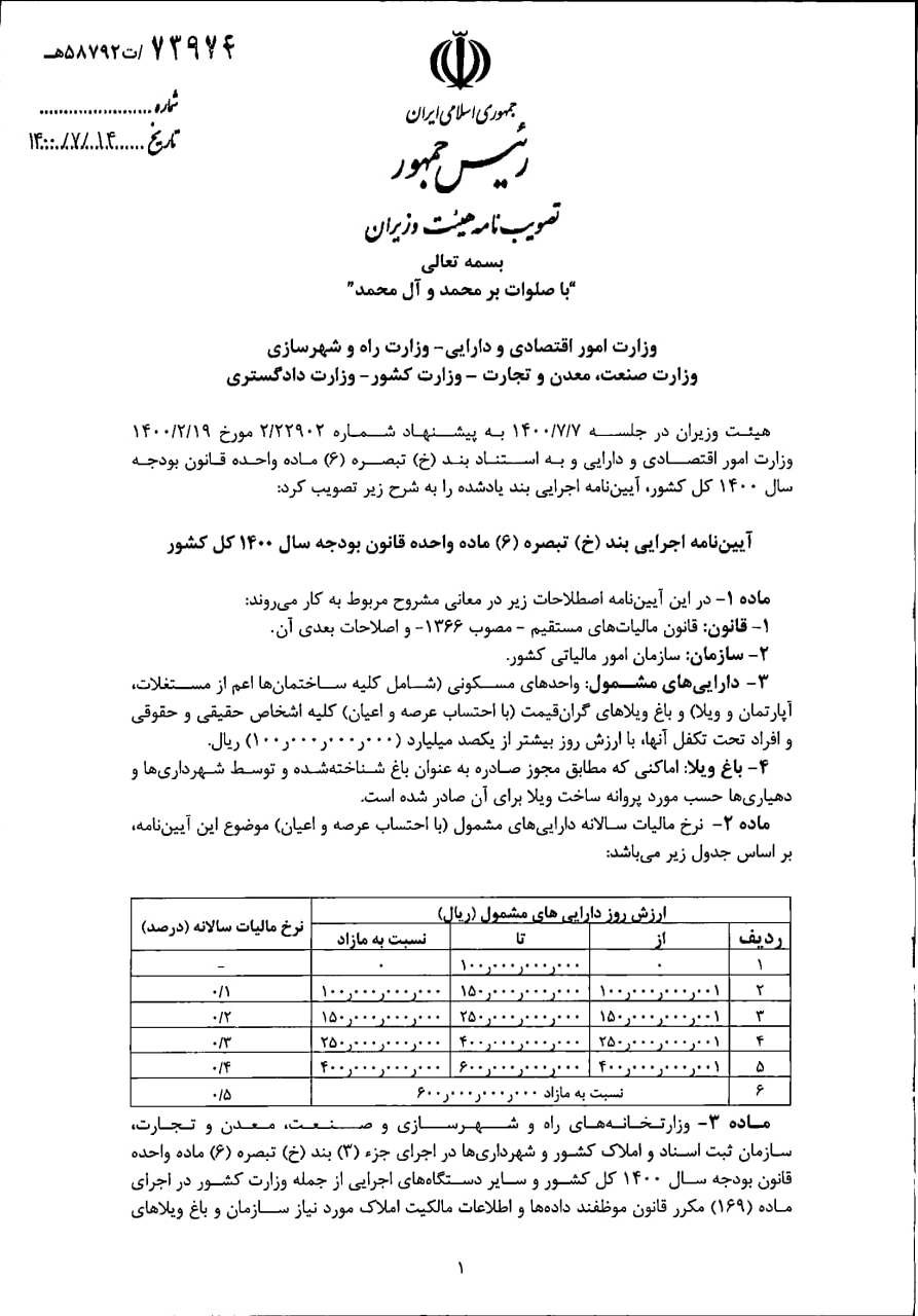 آیین نامه مصوب هیئت وزیران در خصوص نحوه اخذ مالیات از خانه ها و ویلاهای گران قیمت به وزارت خانه های راه و شهرسازی و اقتصاد ابلاغ شد.