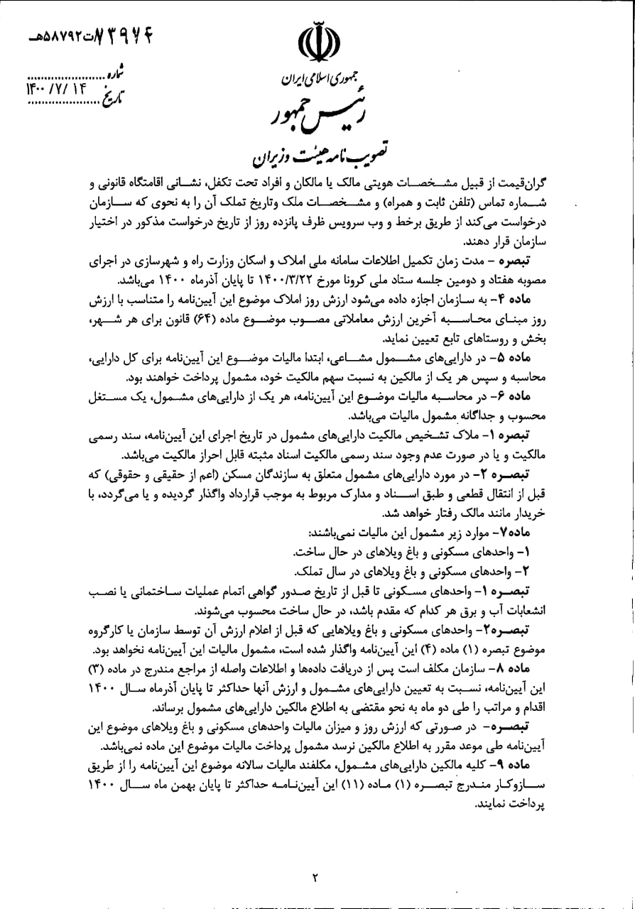 در این آئین نامه، مدت زمان اتمام ثبت اطلاعات در سامانه املاک و اسکان کشور که در اختیار وزارت راه و شهرسازی است پایان آذر ۱۴۰۰ ذکر شده است.