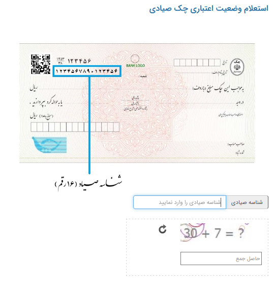 این سرویس برای کلیه کاربران در دسترس است و ورودی این سرویس صرفا کد صیادی است که یا به صورت دستی یا از طریق اسکن کد تصویری وارد میشود. پس از ورود کد صیادی، وضعیت اعتباری دارنده/دارندگان چک نمایش داده میشود.