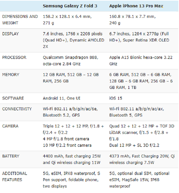 گوشی هوشمند سامسونگ گلکسی زد فولد 3، مزایایی همچون بهره مندی از قلم S Pen، قابلیت تاشو، استفاده از نمایشگر خارجی و دارا بودن دوربین زیر نمایشگر را داراست اما ابعاد بسیار بزرگ آن می تواند یک عیب محسوب شود. در سمت دیگر آیفون 13 پرو مکس نیز از سیستم عامل قدرتمند iOS 15، متریال عالی، پشتیبانی از سیستم شارژ MagSafe و سخت افزارهای بسیار خوب، به عنوان مزیت بهره می برد اما قیمت بالای آن را می توان یک نقص دانست.