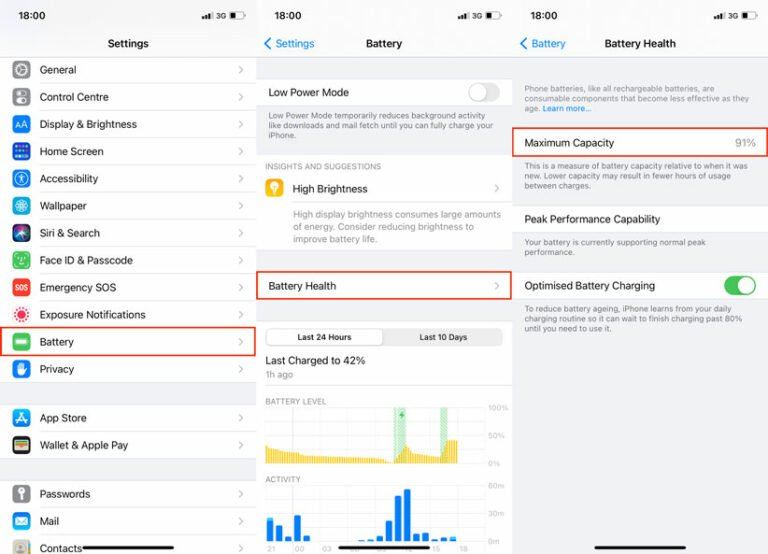 از زمان عرضهی iOS 11.3، اپل این امکان را برای کاربران فراهم کرده است که از طریق سیستم عامل بتوانند سلامت باتری خود را بررسی کنند. برای این کار باید مراحل زیر را طی کنید:
