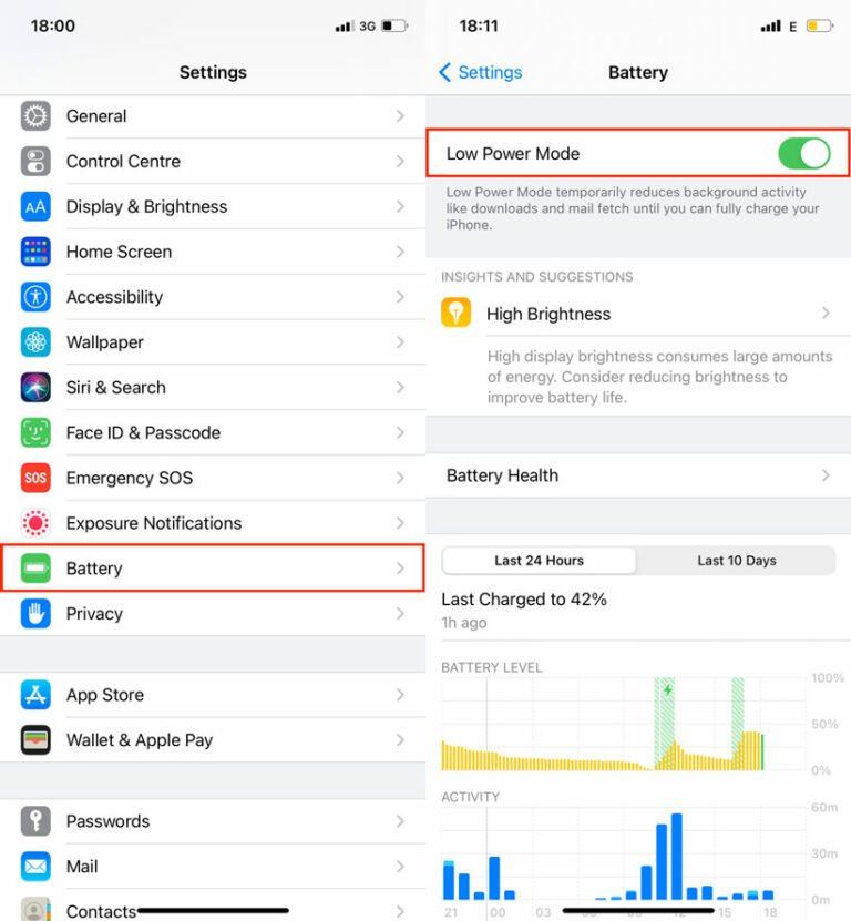 هنگامی که ظرفیت باتری آیفون شما به ۲۰ یا ۱۰ درصد میرسد، از شما درخواست خواهد شد این حالت را فعال کنید. برای اینکار، پس از ورود به تنظیمات و انتخاب بخش Battery، گزینهی Low Power Mode را انتخاب کنید.
