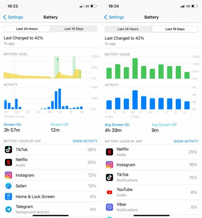 آیفون شما میتواند دادههایی دربارهی اپهایی که بیشترین مصرف باتری را دارند جمعآوری کند. برای دسترسی به این اطلاعات، میتوانید به بخش Battery در تنظیمات گوشی مراجعه کنید. این بخش اپهایی که در ۲۴ ساعت گذشته و ۱۰ روز گذشته بیشترین مصرف باتری را داشتهاند به نمایش میگذارد.