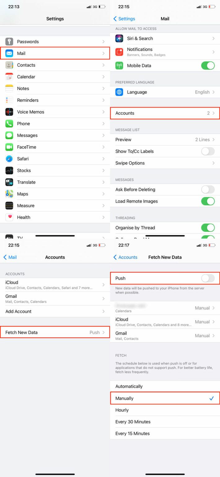 برای تغییر تنظیمات مورد بحث، پس از ورود به بخش تنظیمات گوشی، گزینهی Mail و سپس Account و در نهایت Fetch New Data را انتخاب کنید. در بالای صفحه، میتوانید گزینه Push را غیر فعال کنید. سپس در پایین صفحه میتوانید برنامهی زمانی مورد نظر خود را مشخص یا گزینهی Manually (دستی) را انتخاب کنید.
