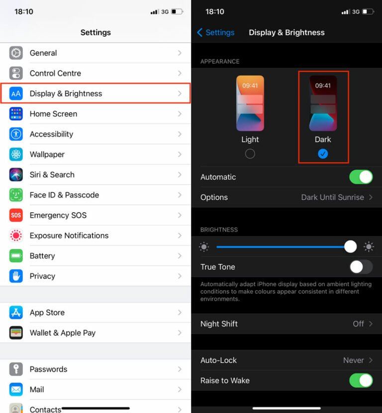 برای فعال کردن حالت تیره، پس از ورود به تنظیمات، گزینهی Display & Brightness و سپس گزینهی Dark را انتخاب کنید. یک راه دیگر برای دسترسی به این حالت، استفاده از مرکز کنترل و لمس طولانی نوار تنظیم روشنایی است.