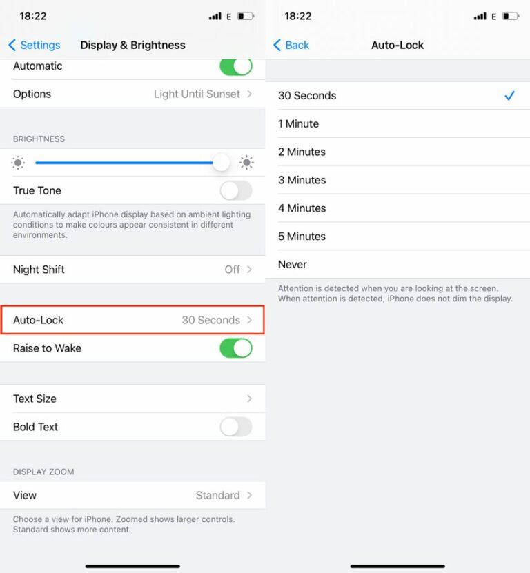 برای فعال کردن قفل خودکار، میتوانید از منوی تنظیمات گزینهی Display & Brightness و سپس Auto-Lock را انتخاب کنید. پس از آن، از گزینههای ارائه شده، مدت زمان دلخواه خود را انتخاب کنید.