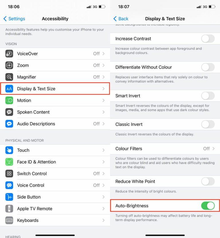 برای غیر فعال کردن تنظیم خودکار روشنایی، پس از ورود به اپ تنطیمات، وارد منوی Accessibility شوید و گزینهی Display & Text Size را انتخاب کنید. در پایین صفحه میتوانید Auto-Brightness را غیر فعال کنید. پس از آن باید دقت کنید که روشنایی نمایشگر خود را بهگونهای مدیریت کنید که بیش از حد نیاز روشن نباشد تا در صورت استفاده طولانی مصرف باتری آن افزایش نیابد.