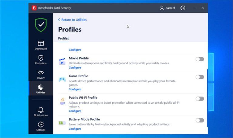 در این برنامه میتوانید پروفایلهای سفارشی برای گیمینگ، تماشای فیلم، وایفای عمومی و حتی حالت مختص صرفهجویی در مصرف باتری ایجاد کنید. با بهرهگیری از پروفایل گیمینگ، آپدیتها و اسکنها حین اجرای بازی انجام نمیشود و میتوانید لیستی از بازیها را مشخص کنید تا در صورت اجرای آنها، این پروفایل به صورت خودکار فعال شود.