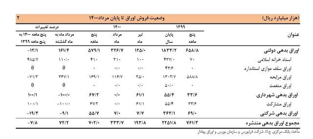 علاوه براین، میزان انتشار اوراق بدهی دولتی در مردادماه امسال با ۱۶۱.۴ درصد رشد نسبت به ماه قبل، ۳۲ هزار و ۶۰۰ میلیارد تومان بوده است.