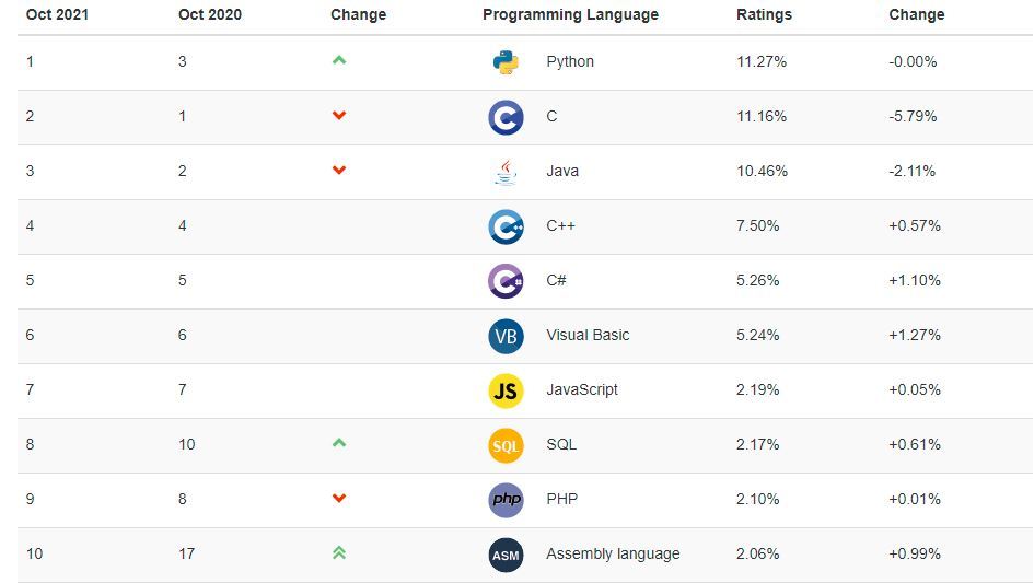 به گزارش موبوایران، پایتون برای اولین بار در ۲۰ سال اخیر با کنار زدن جاوا، جاوا اسکریپت و C به محبوبترین زبان برنامهنویسی دنیا تبدیل شده. ردهبندی ماه اکتبر ۲۰۲۱ شرکت TIOBE بر اساس جستجوهای سطح وب نتیجه یافتههای خود را منتشر کرده است.