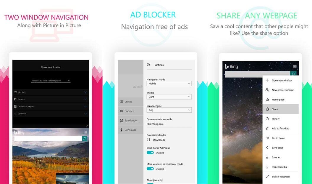 مرورگر سبک Monument با تمرکز روی حفظ حریم شخصی و مسدودسازی تبلیغات توسعه یافته است و از قابلیت‌های ویژه برای جلوگیری از ردیابی فعالیت کاربران بهره می‌برد. ابزار مدیریت دانلود آن نیز از امکانات مناسبی برخوردار است و می‌تواند به صورت خودکار فرمت‌های مختلف ویدیویی را در صفحات وب شناسایی و دانلود کند. سازندگان برنامه ادعا دارند که محصول آن‌ها می‌تواند از تمامی پهنای باند در دسترس شبکه برای دانلود سریع‌تر استفاده کند.