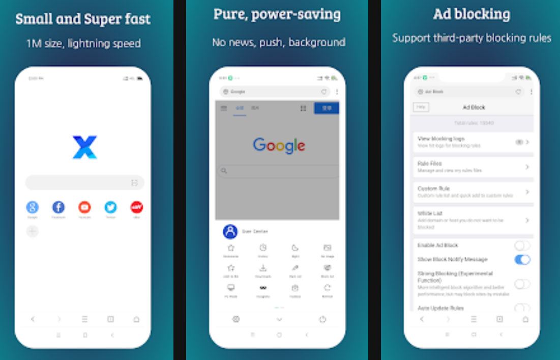 مرورگر XBrowser ظاهری شبیه نسخه‌های قدیمی گوگل کروم را تداعی می‌کند اما تنها کمی بیشتر از ۱ مگابایت حجم دارد. با وجود حجم بسیار کم، امکاناتی مانند مسدودکننده تبلیغات، شخصی‌سازی و پیکربندی برنامه، دانلود منابع موجود در صفحات و پشتیبانی از فرمان‌های لمسی برای کاربران ارائه می‌شود. همچنین حالت مطالعه (Read Mode) برای خواندن متن‌های طولانی در نظر گرفته است.