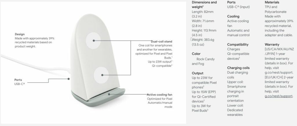 اندازه پیکسل استند ۱۱۳.۹ در ۸۲ در ۷۱.۶ میلیمتر است و وزن تقریبی آن هم ۳۸۳.۶ گرم ذکر شده. این پایه از سرعت ۲۳ وات برای گوشیهای پیکسل، حداکثر ۱۵ وات برای دستگاههای سازگار با شارژ بیسیم Qi و ۳ وات برای پیکسل بادز پشتیبانی میکند. علاوه بر این، دستگاه به درگاه USB Type-C مجهز بوده و حالت کنترل اتوماتیک و دستی برای فعال کردن فن خنک کننده وجود دارد.