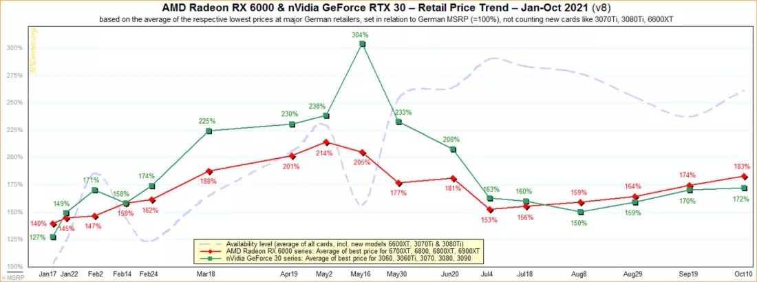 میزان عرضه محصولات این دو شرکت در ماه اکتبر کمی بهتر شد تا شرایط نزولی عرضه کارتهای گرافیک در طول بازه زمانی سه ماهه قبل از آن بالاخره خاتمه یابد. ۳DCenter اطلاعات خود را از خردهفروشیهای آلمان به دست آورده اما شرایط باید در همه جا تقریبا به همین صورت باشد.