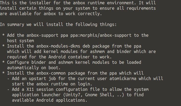 برای نصب Anbox گزینه ۱ را انتخاب کنید. اگر در آینده قصد حذف کردن نرم افزار را داشتید، میتوانید با اجرای دوباره Installer آن و انتخاب گزینه ۲، این کار را انجام دهید. در ادامه توضیح مختصری از فرایند نصب نمایش داده خواهد شد. توجه داشته باشید که anbox runtime به صورت خودکار در هنگام ورود کاربر به لینوکس، اجرا خواهد شد. مورد گفته شده یک کتابخانه نرم افزاری است که منابع مورد نیاز برای اجرای سایر برنامهها را فراهم میکند.