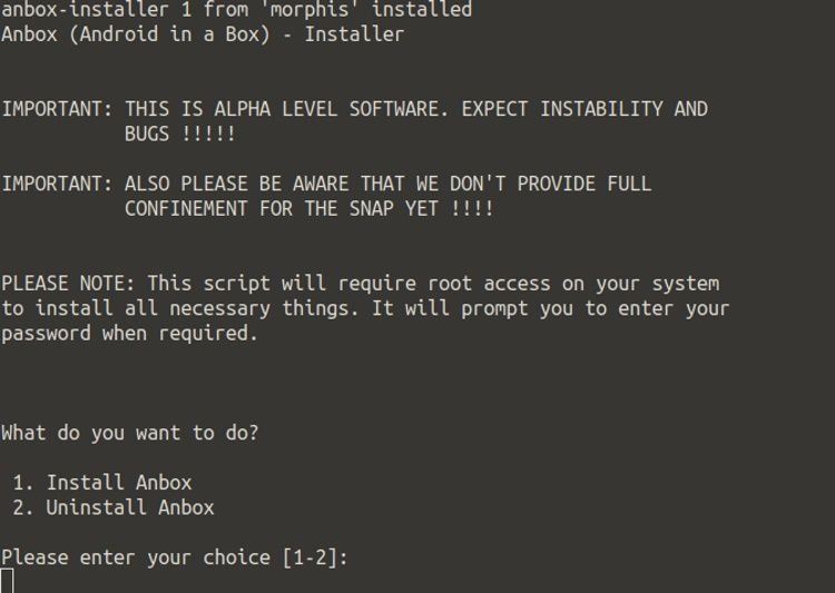 پس از اجرای دستور بالا، رمز عبور خود را وارد کنید و منتظر باشید تا snap اقدام به دانلود پکیج کند. در ادامه دو گزینه Install Anbox و Uninstall Anbox نمایش داده خواهند شد.