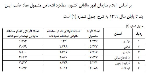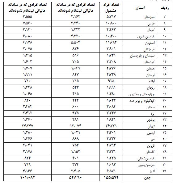 نتایج بررسیها بیانگر آن است که از تعداد ۱۵۵ هزار ۵۷۲ نفر مشمولین شناسایی شده، صرفا تعداد ۵۴ هزار ۴۹۰ نفر معادل ۳۵ درصد مشمولین در سامانه مالیاتی ثبت نام کردهاند، همچنین ۱۰۱ هزار ۸۲ نفر نیز ثبت نام نکردهاند که ۶۵ درصد میشود لازم به توضیح است انجام ثبت نام مذکور به منزله استفاده از پایانه های فروشگاهی نیست.