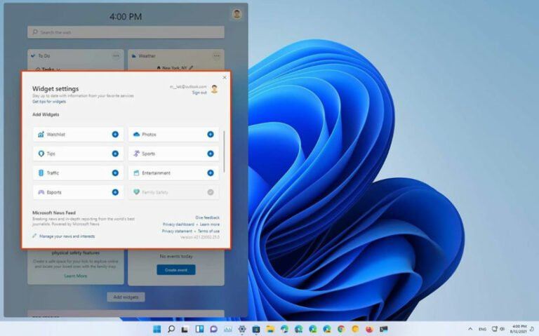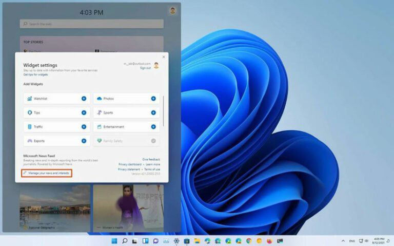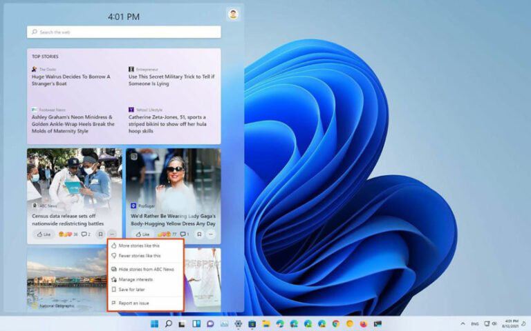 این تجربه تقریبا مشابه همان بخش news & interest موجود در ویندوز ۱۰ است. اما، بهجای ظاهر شدن از تسکبار، ویجتهای ویندوز ۱۱ با رابط کاربری جدید از گوشهی صفحه نمایش در محیط دسکتاپ ظاهر میشوند.