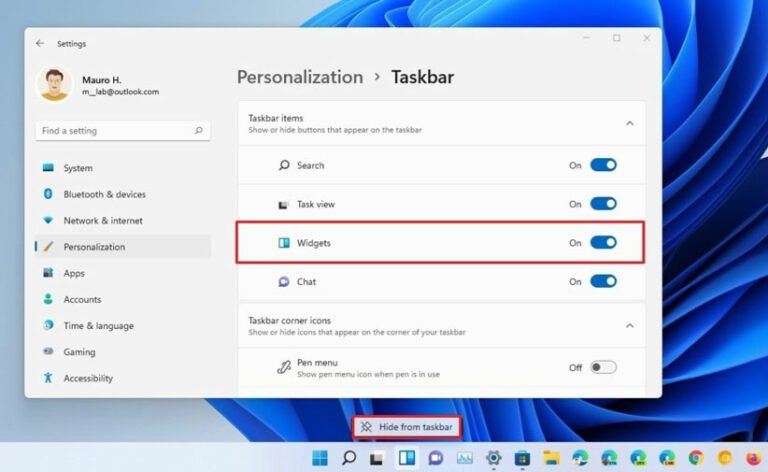 با توجه به این که دسترسی به داشبورد ویجتها از طریق میانبر Win+W یا ژستهای لمسی سریعتر و سادهتر است، میتوانید دکمهی ویژهی ویجتها را که در تسکبار قرار گرفته است حذف کنید. برای این کار باید پس از راست کلیک روی دکمهی ویجتها، گزینهی «Hide from Taskbar» را انتخاب کنید.