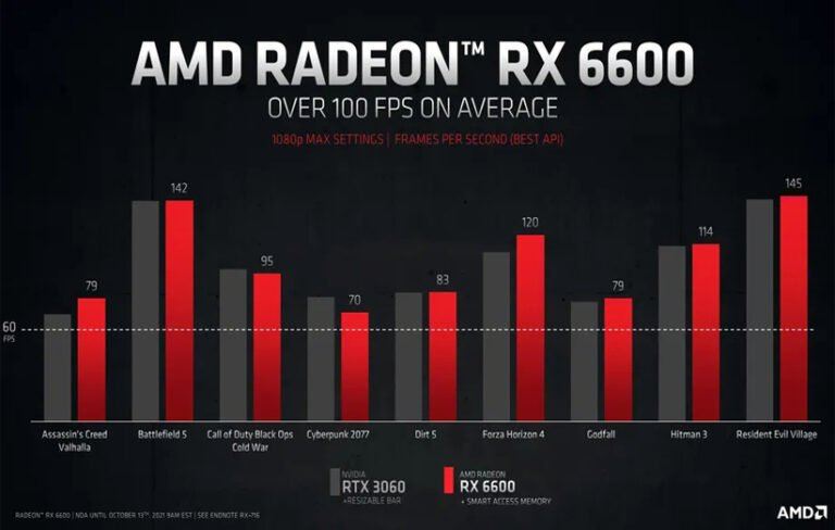 در بررسیهایی که از RX 6600 XT بهعنوان مدل قدرتمندتر این گرافیک با قیمت ۳۷۹ دلار صورت گرفت، به این نتیجه رسیدیم که این محصول قادر است بسیاری از بازیهای روز را با کیفیت ۱۰۸۰P و با اعمال تنظیمات maximum اجرا کند. اما نه همهی آنها را و نه در حالتهایی که مثلا قابلیتهایی نظیر رهگیری پرتو نور فعال باشد. بنابراین نتیجه این شد که این محصول از رقیب اصلی خود یعنی RTX 3060 Ti که فقط ۲۰ دلار گرانتر بود، اندکی ضعیفتر است. در واقع نمایندهی انویدیا در محدودهی گرافیکهای میانرده تقریبا میتوان گفت که رقیب ندارد و ارزش خرید بسیار بالایی دارد.