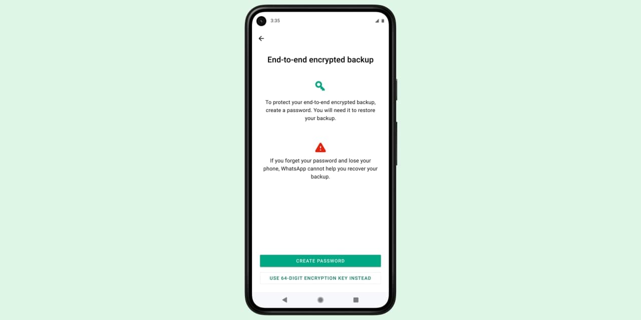 پس از فعال کردن این ویژگی، باید از یک گذرواژه دلخواه یا کلید رمزگذاری ۶۴ رقمی استفاده کنید. پس از تنظیم تمام این موارد، دیگر هیچ فرد دیگری حتی واتساپ، گوگل و اپل قادر نخواهند بود نسخه پشتیبان شما را بدون کلید یا رمز عبور انتخابی بخوانند.