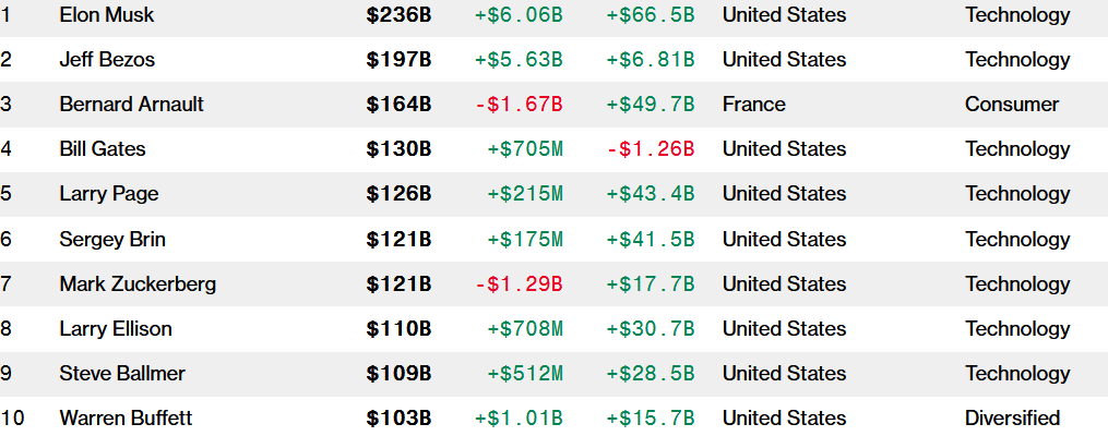 طبق تجزیه و تحلیل به ترتیب ثروت ایلان ماسک و جف بزوس به ۲۳۶ میلیارد دلار و ۱۹۷ میلیارد دلار رسیده است. حالا ماسک سرمایهاش بیش از مجموع ثروت بیل گیتس و وارن بافت بوده و گیتس با ثروت ۱۳۰ میلیارد دلاری در رتبه چهارم شاخص بلومبرگ قرار دارد، همچنین بافت با ثروت ۱۰۳ میلیارد دلاری، در رتبه دهم جایگاهی برای خود کسب کرده است.