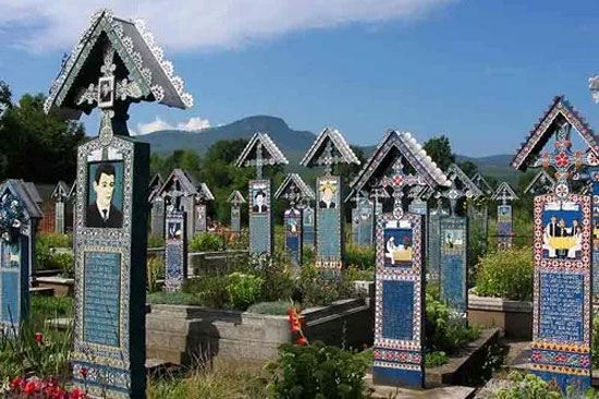 این قبرستان در روستای ساپانتا کشور رومانی واقع شده است. سال 1935 بود که “ائون استان پاتراس” تصمیم گرفت تا خاطره شادی از رفتگان بر جای بگذارد و به همین دلیل شروع به حکاکی بر روی چوبهای رنگیای کرد که در آنها معمولا داستان مرگ شخص و یا یکی از خاطرت او به تصویر کشیده میشدند. همچنین قطعه شعری نیز که مربوط به این فرد بود بر روی این چوبها نوشته میشد. در قبرستان تصاویری که مربوط به وقایع تلخ، جنگ جهانی دوم و رژیم کمونیست رومانی است نیز به تصویر کشیده شده است. پس از مرگ پاتراس، دستیاران او بزرگترین و زیباترین سنگ قبر را برای او در این آرامگاه نصب کردند.