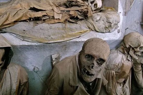 مردگان در دخمههای کاپوچین در سیسیل ایتالیا به شکل ترسناکی نگهداری میشوند، آنها مومیایی شده و با لباسهای معمول خود در کنار یکدیگر به دیوار تکیه داده شده یا بر روی صندلی و تابوت نگهداری میشوند. امروزه حدود هشت هزار نفر، از ثروتمندان و اشراف زادگان سیسیل گرفته تا راهبها در این دخمه که از قرن 16 میلادی مورد استفاده قرار گرفته است وجود دارند. البته روش مومیایی کردن اجساد نیز در این سالها فرق کرده است، مثلا روزالینا لومباردوی دو ساله که در سال 1920 بر اثر بیماری از دنیا رفته است به گونهای مومیایی شده که حتی صورت او نیز سالم مانده است.
