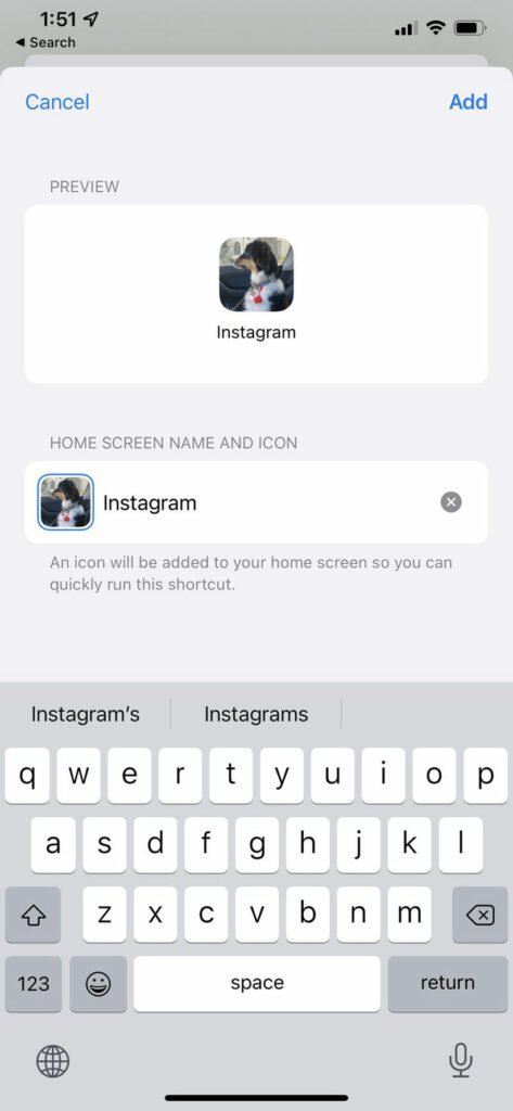 پس از انتخاب این گزینه، از بین اپها اینستاگرام را انتخاب کنید و برای میانبر جدیدی که ایجاد کردهاید یک نام انتخاب کنید. میتوانید از نام خود Instagram هم استفاده کنید. پس از آن، تصویری را که بهعنوان تصویر میانبر جدید در نظر گرفته بودید انتخاب کنید.