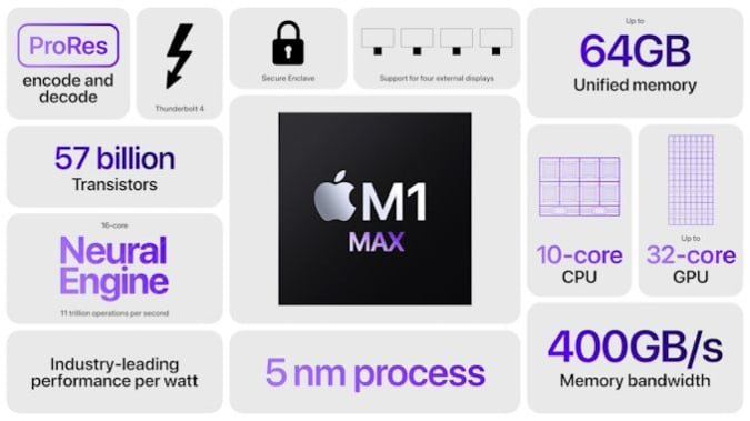 اپل همچنین در این مراسم از چیپست قدرتمندتری با نام M1 Max رونمایی کرده که پیکربندی ۱۰ هستهای CPU دارد که شامل ۸ هسته قدرتمند و۲ هسته کممصرف، ۶۴ گیگابایت حافظهی رم با پهنای باند ۴۰۰ گیگابایت بر ثانیه و پردازندهی گرافیکی ۳۲ هستهای است. تراشهی M1 Max دارای ۵۷ میلیارد ترانزیستور است که بزرگترین تراشهای که اپل تاکنون ساخته بهحساب میآید. همچنین اپل در این مراسم اعلام کرده که تراشههای جدید M1 Pro و M1 Max تا ۱٫۷ برابر عملکرد پردازشی قویتری نسبت به چیپست M1 دارند.