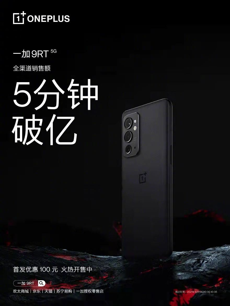 با توجه به پست منتشر شده در صفحه رسمی وان پلاس در شبکه اجتماعی ویبو چین، وان پلاس ۹RT توانسته در عرض ۵ دقیقه به رقم فروش حدود ۱۵ میلیون دلاری دست پیدا کند که براساس نوع ظرفیت حافظه، این شرکت احتمالا رقمی بین ۲۶,۰۰۰ تا ۳۲,۰۰۰ دستگاه از این موبایل به فروش رسانده است.