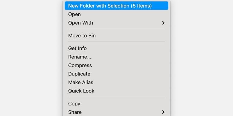 برای انجام فرایند گفته شده، ابتدا فایلهای موردنظر خود را انتخاب کرده و سپس روی آنها کنترل + کلیک کنید یا به منوی File بروید. اکنون روی گزینه New Folder with Selection کلیک کنید. نام دلخواه خود را برای فولدر جدید وارد کنید و در نهایت کلید Enter را فشار دهید. اکنون فایلهای انتخاب شده به فولدر جدید انتقال پیدا میکنند.
