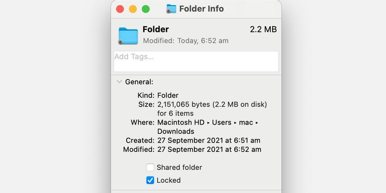 جهت قفل کردن یک فولدر، پس از انتخاب آن، از کنترل + کلیک استفاده کنید یا به منوی File مراجعه نمایید. سپس گزینه Get Info را انتخاب کنید و تیک عبارت Locked را در پنجره Info بزنید. برای آنلاک کردن فولدر نیز تنها کافی است تیک گفته شده را بردارید.