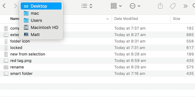 برای دسترسی و مشاهده ساختار فولدرها در نرم افزار فایندر ابتدا روی نام فولدر کنونی در نوار ابزار بالایی برنامه کلیک کنید. سپس فولدری که قصد مشاهده آن را دارید، انتخاب نمایید. اگرچه این نکته بسیار ساده به نظر میرسد، اما میتواند در زمان مورد نیاز جهت ناوبری به مسیرهای مختلف، صرفهجویی به عمل آورد.