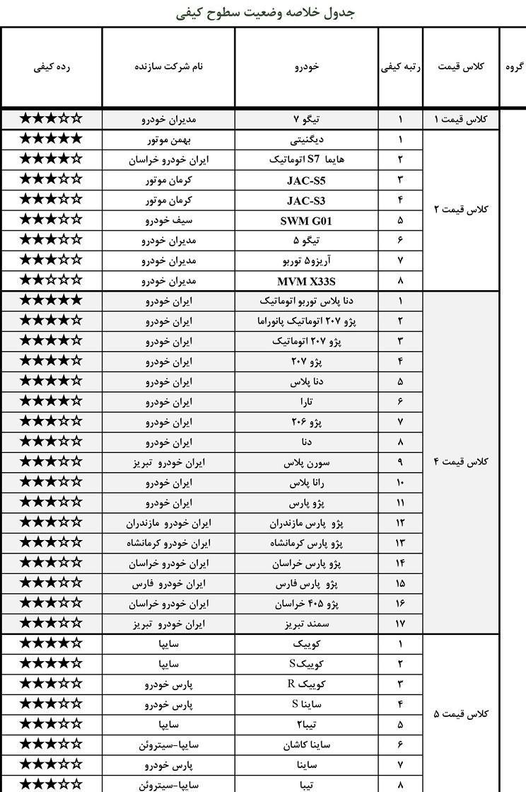 همچنین پژو 405 ایرانخودرو خراسان سه ستاره کیفی کسب کرد و تارای ایرانخودرو موفق به کسب 4 ستاره کیفی شد. در سطح قیمتی پنج نیز کوییک سایپا 4 ستاره به دست آورد. در این سطح قیمتی کوییک R پارس خودرو، تیبا 2 شرکت سایپا و همچنین ساینای پارس خودرو موفق به دریافت 3 ستاره کیفی شدند.