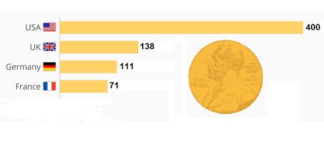 در فیلم زیر میتوان برترین کشورهای دریافت کننده جایزه نوبل را مشاهده کرد که در میان آنها کشور آمریکا با ۳۹۰ جایزه تا سال ۲۰۲۰ در صدر جدول برندگان قرار دارد و پس از آن بریتانیا با ۱۳۵ جایزه در رتبه دوم و آلمان با ۱۰۹ جایزه در رتبه سوم قرار دارد پس از آن فرانسه در رتبه چهارم قرار گرفته است.