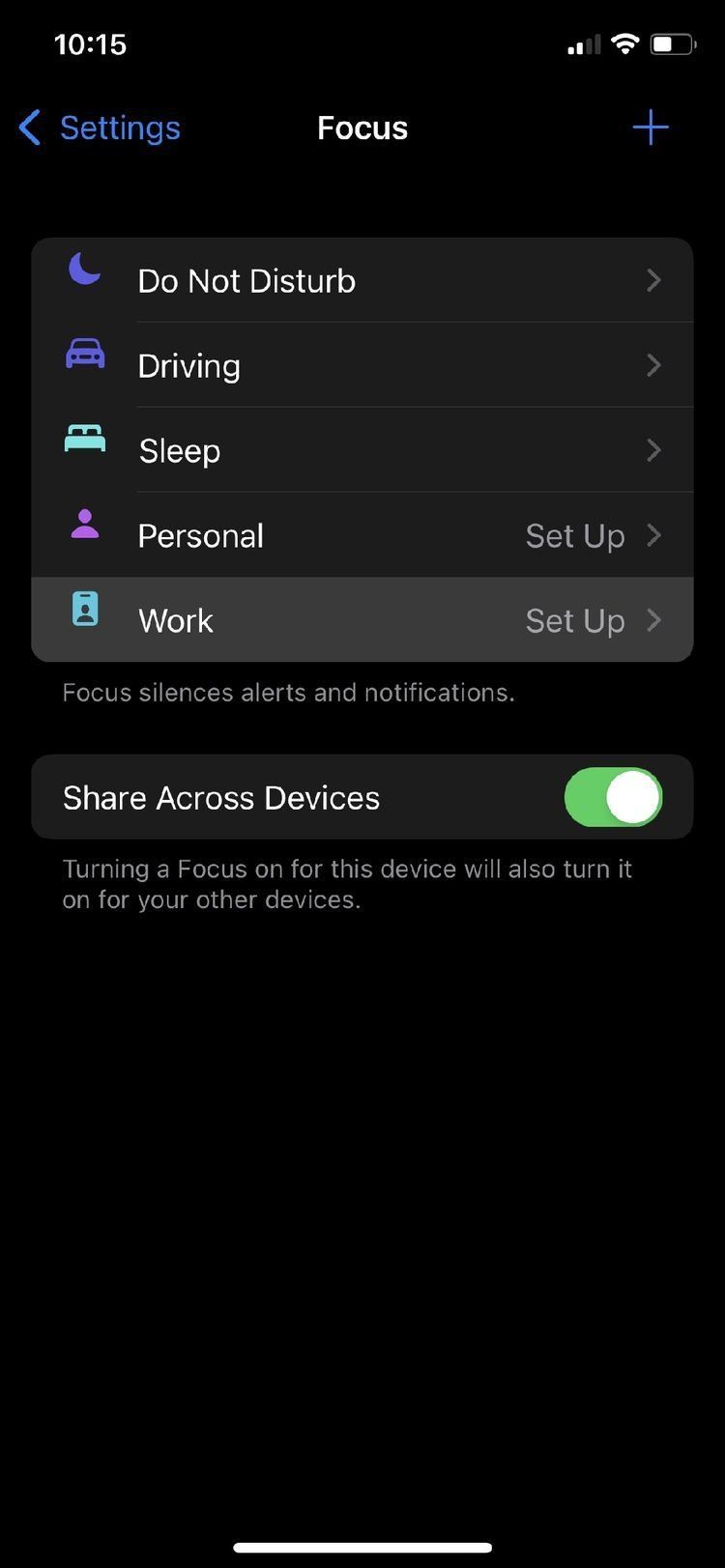 در اینجا با چندین حالت فوکوس پیش فرض روبه‌رو می‌شوید. شما می‌توانید یکی از آن‌ها مانند Work یا Personal را برای راه‌اندازی انتخاب کنید یا اینکه با ضربه روی گزینه +، یک پروفایل جدید بسازید.