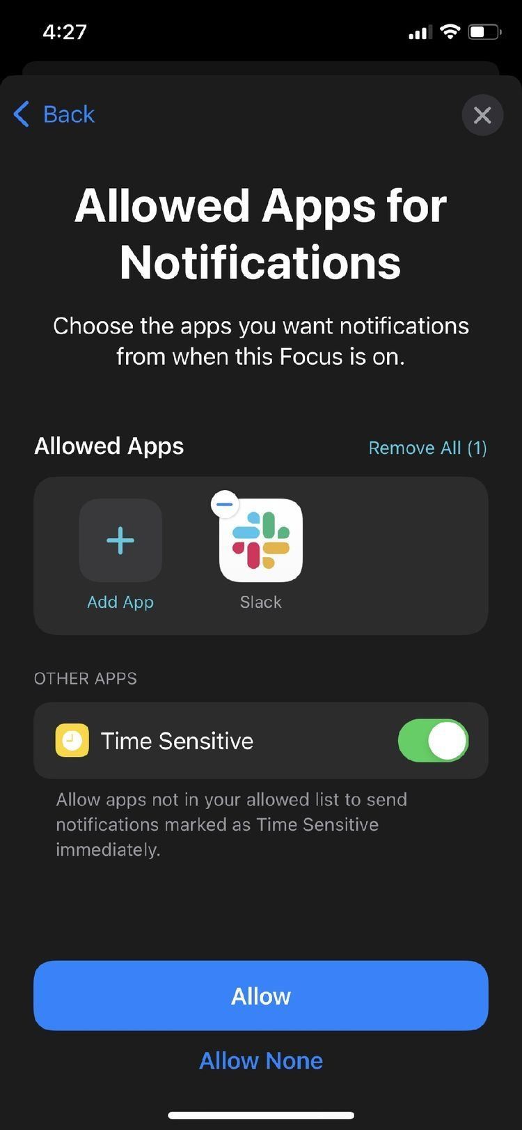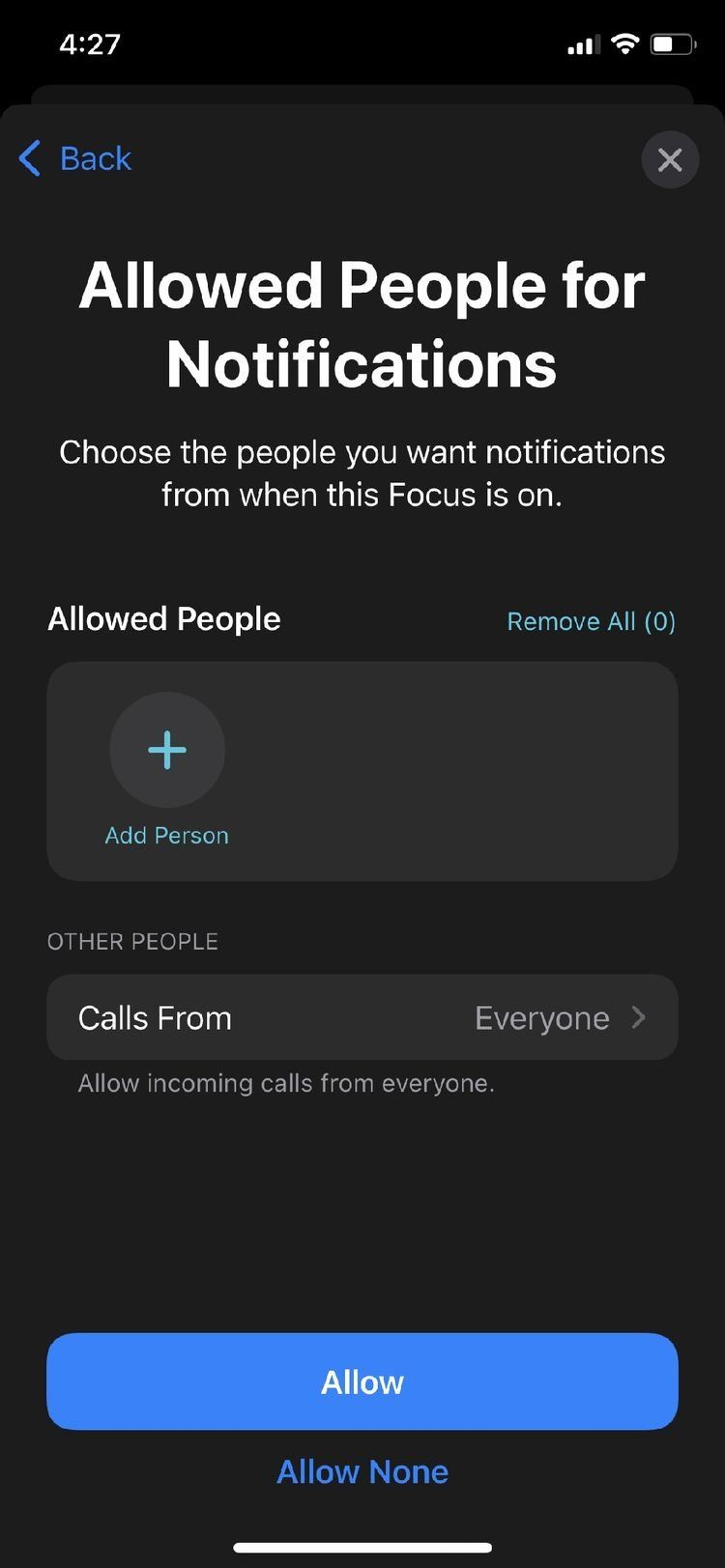 حالا با انتخاب گزینه مدنظرتان، می‌توانید مخاطبینی که در زمان فعال بودن این حالت می‌توانند به شما دسترسی داشته باشند را انتخاب کنید. اگر نمی‌خواهید فردی به شما دسترسی داشته باشد، گزینه Allow None را انتخاب کنید.