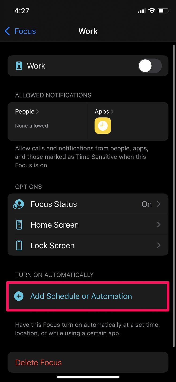 حالا که راه‌اندازی اولیه به اتمام رسید، شما پیکربندی پیش فرض حالت فوکوس را می‌بینید. اگر می‌خواهید حالت فوکوس خودش خاموش و روشن شود، روی گزینه Add Schedule یا Automation ضربه بزنید.