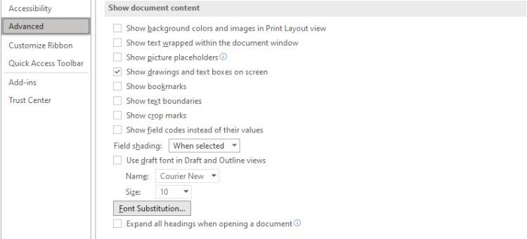 در اینجا به سمت پایین اسکرول کنید تا به بخش Show document content برسید و سپس چک باکس Show bookmarks را فعال کنید.