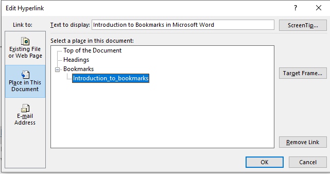 با اینکار، باکس Insert Hyperlink باز میشود. در صفحه Link to، روی گزینه Place in This Document کلیک کنید. درون باکس Select a place in this document، روی نام بوکمارکی که پیشتر ساختید، کلیک کنید و در پایان گزینه OK را بزنید.