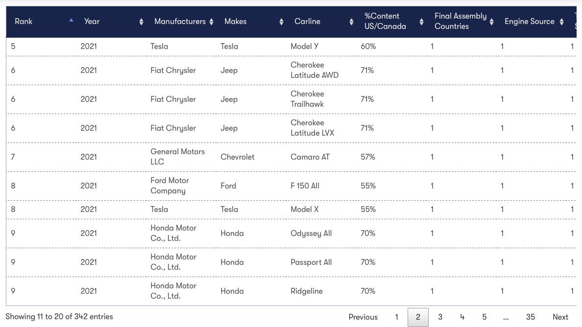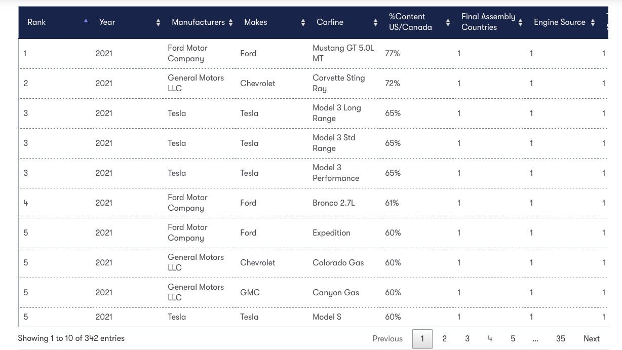 شورلت کوروت استینگری نیز با ۷۲ درصد داخلی سازی در رتبه بعدی قرار دارد. تسلا مدل S و مدل Y نیز با ۶۰ درصد داخلی سازی در رتبه های بعدی قرار دارند. مدل X نیز ۵۵ درصد داخلی سازی دارد.