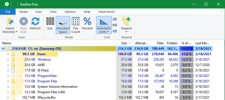 بیشتر فایل های بزرگ که فضای دیسک ذخیره سازی را اشغال کرده اند احتمالا در پوشه حساب کاربری در پوشه Users قرار دارند. این قسمت شامل اسناد، تصاویر، ویدئوها، و موارد مشابه دیگر می شود. احتمالا فضای زیادی توسط پوشه AppData اشغال شده است که بسیاری از برنامه ها مواردی مانند اطلاعات و موارد ترجیحی را در آن ذخیره می کنند. به عنوان نمونه، کش های کروم و اسپاتیفای می توانند تا چندین گیگابایت فضا را در اینجا اشغال کنند.