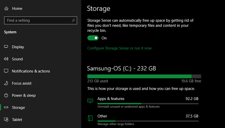 ویندوز 10 دارای قسمتی است که بسیاری از عملکردهای بالا را با یک رابط کاربری بروز و زیباتر در اختیار کاربر قرار می دهد. برای دسترسی به این بخش به آدرس Settings > System > Storage مراجعه کنید. شما می توانید زمانی که فضای دیسک ذخیره سازی کم است یا هرچند وقت یکبار از استوریج سنس (Storage Sense) برای پاکسازی اتوماتیک فایل ها استفاده کنید. روی Configure Storage Sense or run it now کلیک کرده تا این گزینه ها را تغییر دهید.