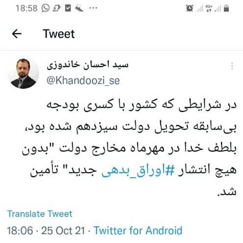 سیداحسان خاندوزی وزیر امور اقتصادی و دارایی بعدازظهر امروز (دوشنبه سوم آبان) در این خصوص در صفحه توییترش نوشت: در شرایطی که کشور با کسری بودجه بی سابقه تحویل دولت سیزدهم شده بود، به لطف خدا در مهرماه مخارج دولت «بدون هیچ انتشار اوراق بدهی جدید» تامین شد.